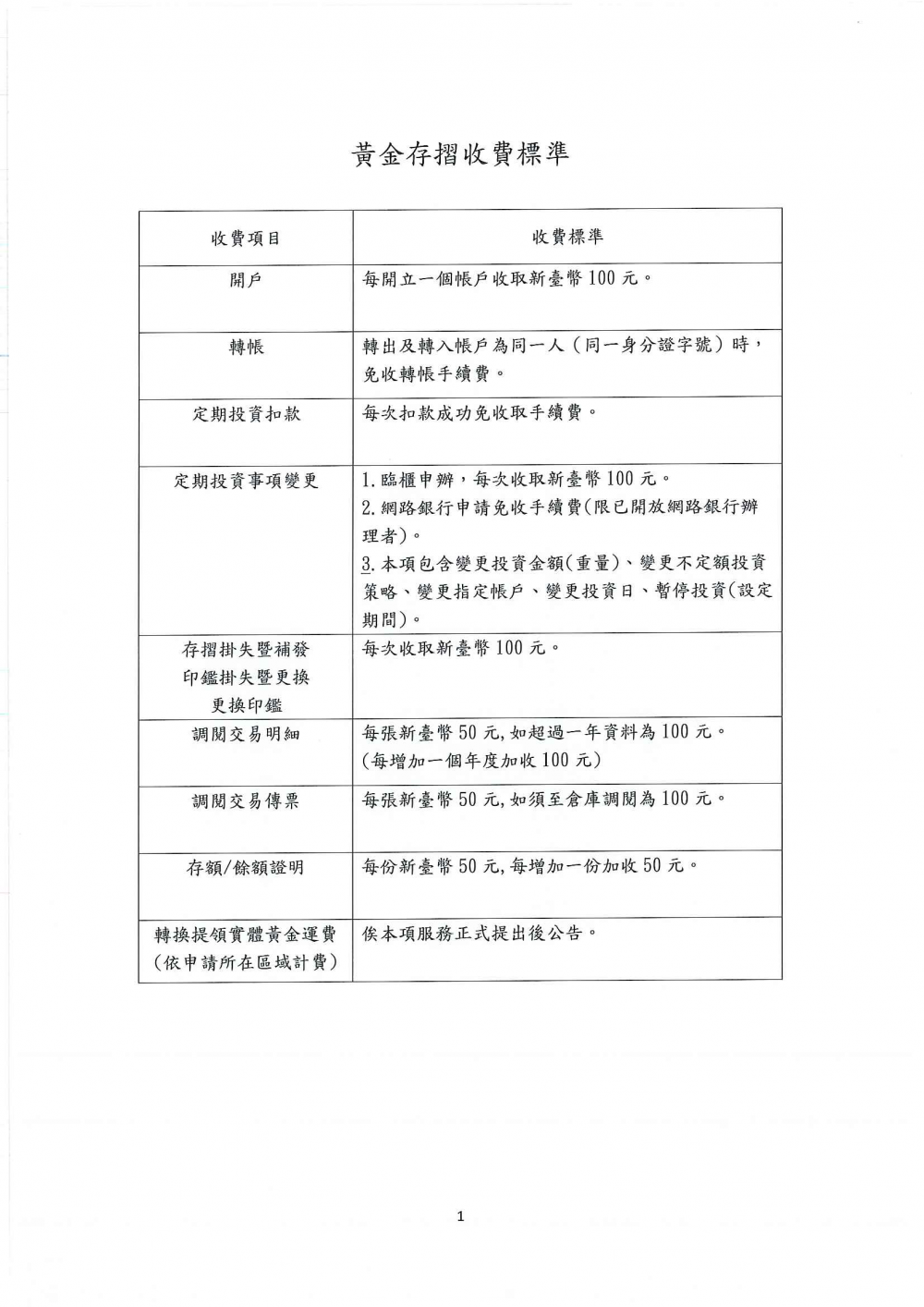 黃金存摺業務項目及收費標準