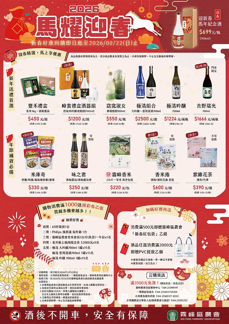 活動地點:霧峰區農會1樓農創家超市、4樓台灣農漁業物產館、霧峰農會酒莊購物中心